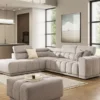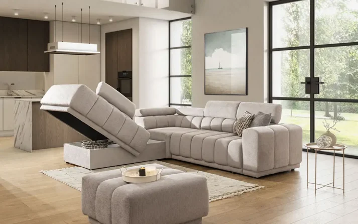 Sofa bed AUSTIN Open offers softly contoured backrest and adjustable headrests that provide tailored comfort, while the wide seat provides ample room to relax and lounge. Its puma-style sleeping mechanism opens with ease, transforming the piece into a comfortable bed when needed. A concealed storage compartment keeps essentials neatly tucked away, supporting an uncluttered space.