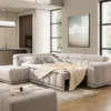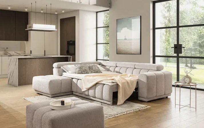 Sofa bed AUSTIN Open makes a bold statement with its broad, low-sitting frame and grounded silhouette – a design that feels both commanding and inviting. With low legs and a solid, expansive base, it anchors the room with quiet confidence and a sense of effortless luxury.